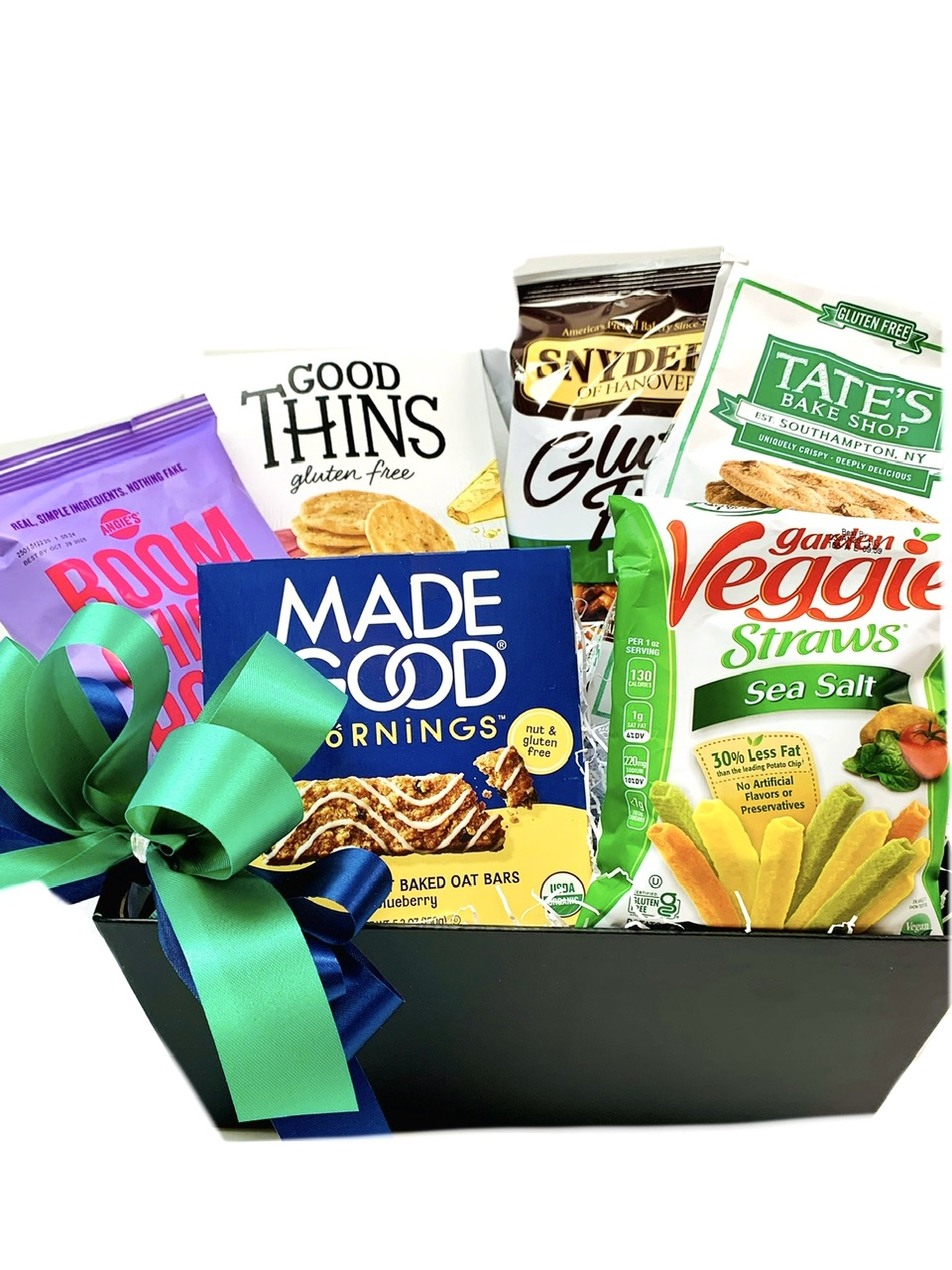 Inside a reusable container are gluten free Tate's Chocolate Chip Cookies, Angie’s Boom Chick Kettle Popcorn, Made Good Blueberry Bars (5), Good Thins Parmesan & Garlic Crackers, Seasoned Pretzels and Garden Veggie Sea Salt Straws.