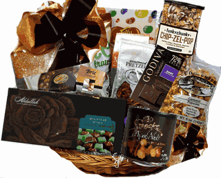 Our Grand Gourmet basket contains 2 kinds of flavored cookies, Jelly Belly 40 assorted flavors , Ghirardelli’s Assorted flavored chocolates bag, Minnesota's famous Abdallah chocolates, 2 Godiva Chocolate bars, 1 flavored cheese,1flavored crackers, Dots seasoned pretzel twists, large bag caramel popcorn, Angie’s kettle popcorn flavored snack mix, Baked in Brooklyn sesame sticks, Stacy’s flavored chips