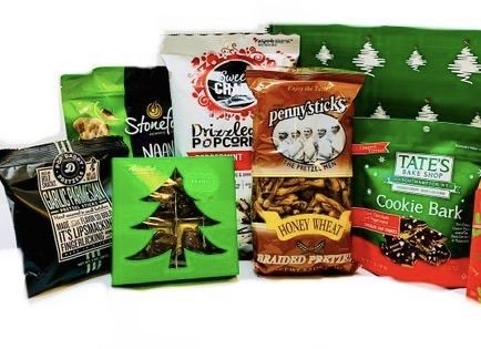with sweet and salty snacks. Includes Sweet Choas Peppermint Chocolate Drizzled popcorn, Abdallah Xmas Tree box Dark Chocolate Sea Salt Caramels, Honey Wheat Twisted Pretzels, Pepperidge Farm Linzer Cookies, Tate’s Chocolate Cookie Bark, Stonefire flavored Naan chips, Pop Daddy Garlic Parmasean cheese pretzels.