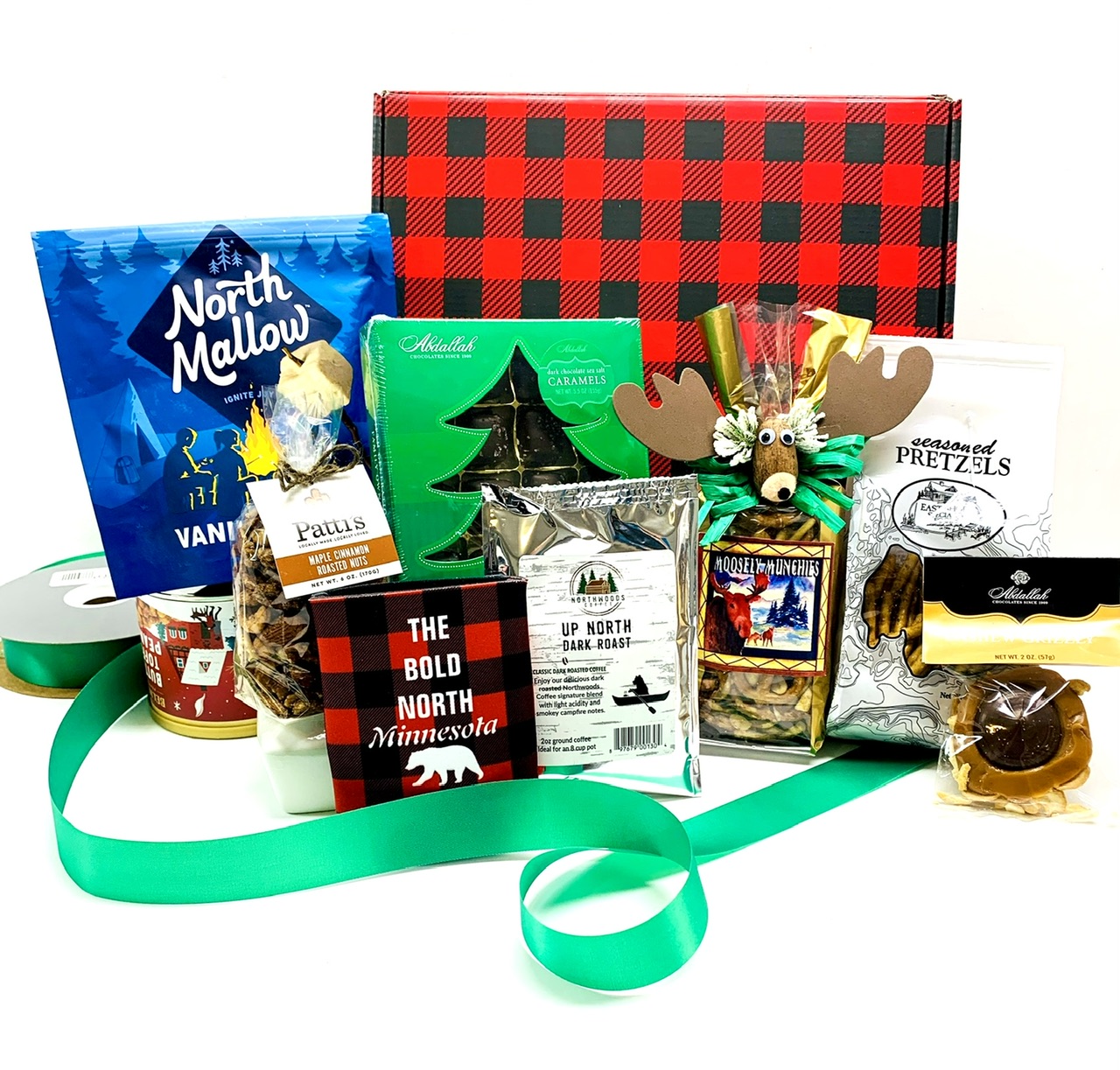 Included in a reusable gift box are Patti’s Maple Cinnamon mixed nuts, East Shore Seasoned Pretzels , Up North gourmet coffee, Bold North can cozy, Abdallah Sea Salt Caramels, North Mallow Bean flavored marshmallows and Mouse Munchies and Abdallah Cashew Bear Paw.